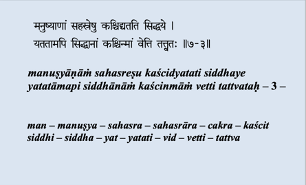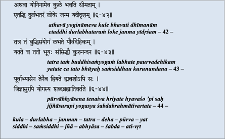 Cette renaissance est plus difficile à obtenir mais elle offre plus de possibilités. De naissance en naissance la sagesse du yogin s’accroît grâce à son désir de connaissance. Il est poussé irrésistiblement vers son accomplissement total, saṁsiddhi.