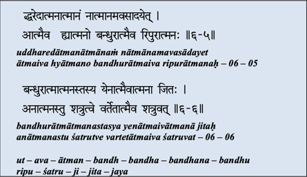 Dans les versets d’aujourd’hui le Seigneur Kṛṣṇa nous met en garde : nous pouvons être l’ami, bandhu, du soi, ātman, c’est-à-dire nous-même. Mais n’oublions pas que notre pire ennemi, śatru, est aussi nous-même. Alors, appuyons-nous sur le Soi suprême, ātman, pour maîtriser le corps, les sens et le mental, pour nous vaincre nous-même, jati, et ainsi devenir notre propre ami.