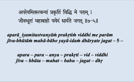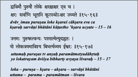 Les conditions limitantes dans le monde nous font voir plusieurs niveaux du Soi. D’abord le puruṣa périssable qui se manifeste par tout ce qui existe. Et puis le puruṣa impérissable qui se manifeste en tant que māyā. Mais au-dessus de tout, immobile, il y a un autre puruṣa de nature totalement différente des 2 autres. C’est le Soi suprême.