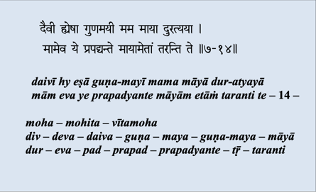 Ce qui nous bloque dans notre quête, c’est māyā, l’illusion, que nous prenons pour la réalité et qui nous empêche de voir le Réel, brahman. La seule solution que propose Śrī Kṛṣṇa