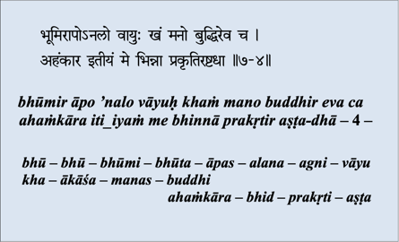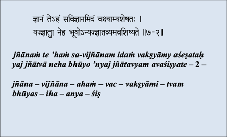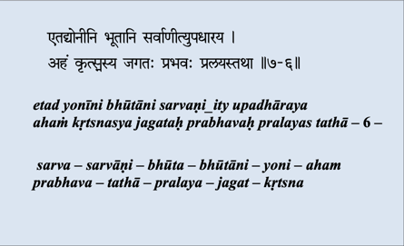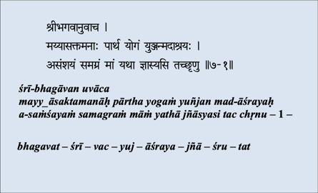 Ce début du chapitre 7 de la Bhagavad Gītā est la suite de l’enseignement donné par Kṛṣṇa à la fin du chapitre 6 : le meilleur des yogin est celui qui reste totalement concentré sur Dieu lui-même. C’est la culmination de la bhakti. Dans ce 1er verset du chapitre 7, Kṛṣṇa nous invite à prendre refuge et à pratiquer le yoga avec le mental fixé sur le Seigneur.