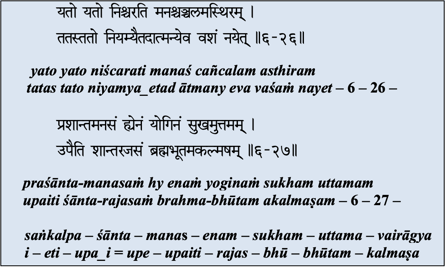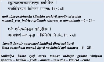 Le yogin est invité à abandonner tous les désirs, kāma, qui viennent de l’imagination, saṅkalpa. Il doit faire preuve de calme et de fermeté. Puis, petit à petit, ayant fixé le mental, manas, sur le Soi, ātman, il ne pense plus à rien d’autre que le Soi.