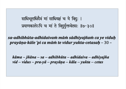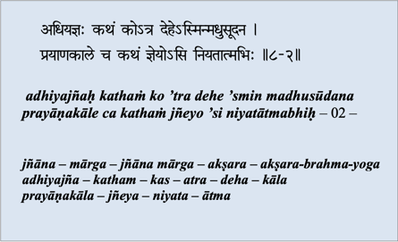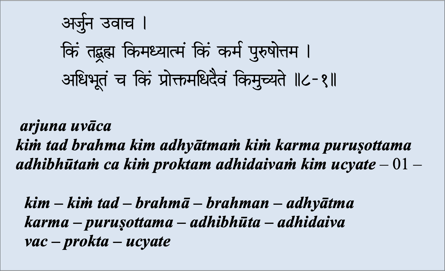 Il demande à Kṛṣṇa la signification de adhiyajña, l'essence du sacrifice. Et surtout il veut savoir comment le Seigneur peut-il être connu au moment de la mort par ceux qui ont la maîtrise d’eux-mêmes.