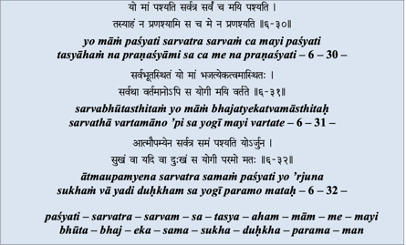 C’est la clé de la réalisation du yogin. Il voit le Seigneur en tous les êtres, sarvabhūtāni. Il voit tous les êtres dans le Seigneur. Alors il demeure toujours en brahman quelle que soit sa condition ou son activité. Tout ce qui arrive aux autres lui arrive à lui-même, que ce soit bonheur, sukha, ou malheur, duḥkha. Ainsi il ne nuit jamais à personne. Il reste établi dans le Soi, éternellement.
