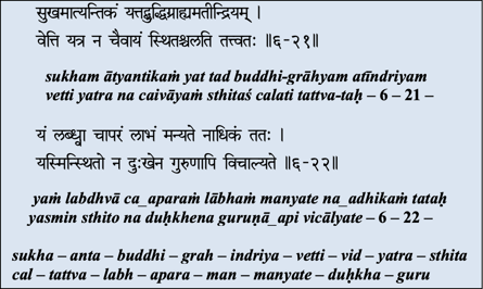 Le yogin qui a atteint la Réalité, tattva, grâce à la buddhi l’intelligence pure, est établi, sthita, dans le Soi à jamais. Il n’existe rien de supérieur à cet état dans lequel on ne peut plus être perturbé par aucune souffrance, duḥkha.