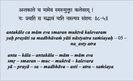 Celui qui quitte son corps en ne pensant qu’au Seigneur atteint l’état de l’Être suprême. Il a achevé son voyage, toutes les expériences des vies terrestres ont été consommées. Il