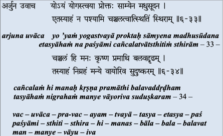Le Seigneur répond à Arjuna : oui le mental est difficile à maîtriser, comme le vent ; mais oui, il est possible de l’atteindre en s’efforçant par la pratique persévérante, abhyāsa, et le détachement, vairāgya. Si l’état de yoga est difficile à obtenir par celui qui n’a pas maîtrisé son mental, il peut être atteint par celui qui est maître de soi et qui s’efforce par les moyens appropriés.