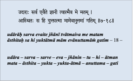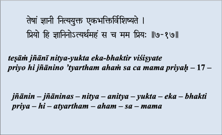 Tous ceux qui pratiquent la bhakti cherchent le Seigneur. Parmi eux, le jñānin, le sage, est totalement absorbé dans sa quête. Rien ne peut le détourner de son chemin vers le but