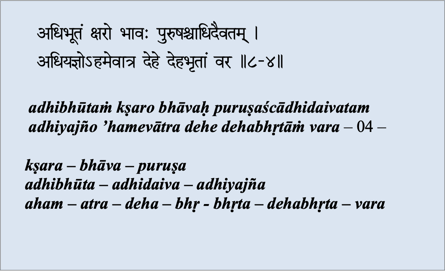 Tout ce qui existe est kṣara, périssable, mais le Seigneur est adhidaiva présent en tout, en tant puruṣa. Étant présent dans le corps, il est adhiyajña, l’essence du