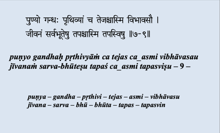 Le Seigneur est rasa, l’essence subtile de tout. Il est ce qui est le plus subtil et le plus pur dans tous les éléments. Il est tejas, la lumière ; il est jīvana, la vie. Il est tapas, l’austérité des ascètes.