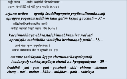 C’est la question qu’Arjuna, inquiet, pose au Seigneur. Est-ce que celui qui malgré sa foi profonde, śraddhā, ne parvient pas à l’état de yoga, finit par périr comme un nuage de pluie se