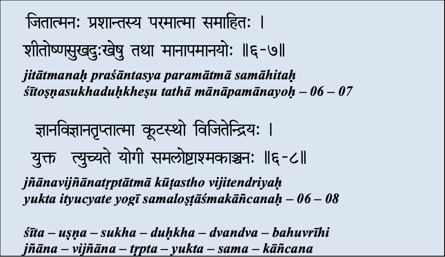 Celui qui s’est rendu maître de ses sens, de son corps et du mental, devient indifférent aux paires d’opposés, dvandva, le froid, le chaud, etc... Il a acquis la connaissance des Écritures, jñāna, il est heureux dans la réalisation, vijñāna. Il est immuable, kūṭastha. Il est établi dans le Soi.