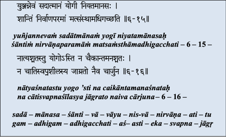 Celui qui médite et qui a maîtrisé son mental, atteint la paix du nirvāṇa, la libération suprême qui se trouve dans l’union avec le Seigneur. Mais, pour réussir, le yogin, doit éviter tout