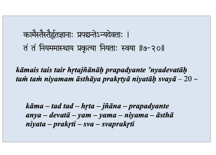 Les chercheurs spirituels qui n’ont pas la connaissance, égarés qu’ils sont à cause des désirs, s’adressent à d’autres divinités, conditionnés par leur propre nature, au lieu de se tourner vers le Seigneur car ils ignorent qu’Il est le Tout.