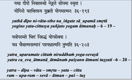 Cette image du mental, citta, comme la flamme, dīpa, abritée du vent, exprime cet aboutissement de la pratique du yogi qui se concentre sur, l’ātman, le Soi. Alors le yogi qui fait l’expérience du Soi en lui-même grâce à la méditation, se plonge dans la joie éternelle du Soi.