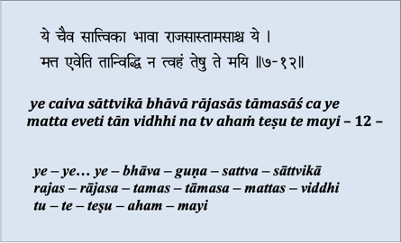 Tout ce qui existe est fait des 3 guṇa, les 3 qualités, sattva, rajas, et tamas. Quelles que soient les 3 qualités, elles proviennent toujours de Lui, mais Lui-même n’en