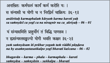 Le renonçant, saṁnyāsin, accomplit ses actions, karma, mais il est détaché de leurs fruits, phala. On doit vivre cette contradiction apparente : être engagé dans l’action, karma, et être dans le renoncement, saṁnyāsa. Alors on laisse tomber toute pensée liée à un désir, tout saṅkalpa, pour se plonger dans le karma yoga.