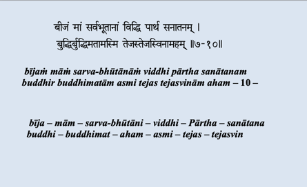 Dans ce verset le Seigneur dit qu’il est le bīja, le germe éternel de tous les êtres. Et quand nous sommes intelligents, buddhi-mat, c’est Lui qui l’est en nous. Et quand nous sommes courageux, tejasvin, c’est Lui qui l’est en nous.