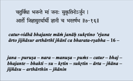 Tous les quatre adorent le Seigneur. Ce sont : ārta, celui qui souffre ; jijñāsu, le chercheur spirituel ; arthārthin, celui qui désire la richesse ;