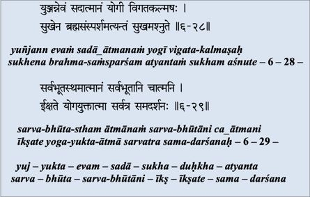 C’est ce à quoi atteint le yogin qui s’est maîtrisé lui-même et qui, ayant transcendé les limites, atyanta, jouit du bonheur ininterrompu de brahman. Il a une vision égale, samadarśana, sur tout. Il a compris l’identité de ātman avec brahman, toujours et partout, sarvatra.