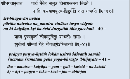 Kṛṣṇa rassure Arjuna : le yogin qui a fait le bien, ira, après sa mort dans les mondes heureux Et quand il renaîtra dans une vie future il sera dans une famille pure et