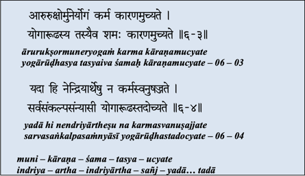 L’action, karma, pratiquée en étant détaché des objets des sens, indriyārtha, et des fruits de l’action, karmaphala, est le moyen que suit le, muni, le sage qui désire atteindre l’état de yoga. Quand il l’a atteint c’est la sérénité, śama, qui devient le moyen car le sage a renoncé à tout saṅkalpa, à toute volonté personnelle.