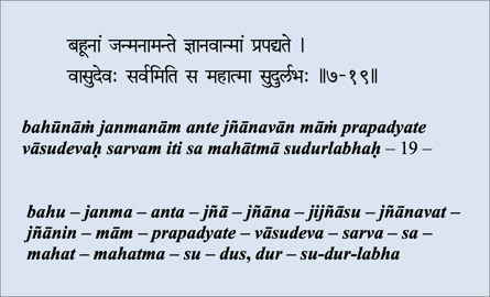 C’est ce que déclare le sage qui a acquis la connaissance après de nombreuses naissances. Celui qui réalise ainsi le Soi mérite le nom de Mahātmā, grande âme. Rien ne peut le dépasser ou même l’égaler. Mais une telle grande âme est très rare.