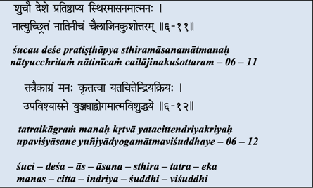 Dans ce passage Kṛṣṇa explique les règles à respecter pour s’installer du mieux possible en posture de méditation. Il faut choisir un lieu pur, śuci deśa et un siège confortable, āsana. Puis essayer de maintenir le mental concentré en un point, ekāgra, et garder sous contrôle l’action, les sens et les pensées. Ainsi la pratique du yoga mène à la complète purification, viśuddhi.