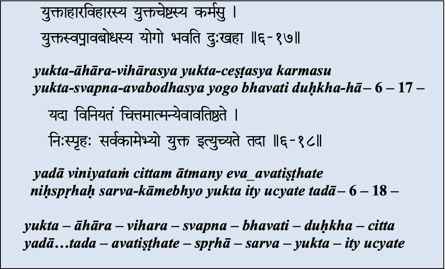 Pour détruire la souffrance, duḥkha, il faut être modéré, yukta, dans sa nourriture, āhāra, modéré dans ses efforts pour son travail, et régulier dans la veille et le